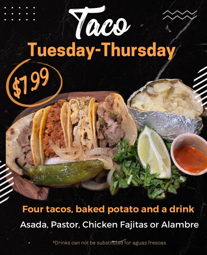 6 piece tacos and baked potato, includes cilantro, onion, limes and red salsa.