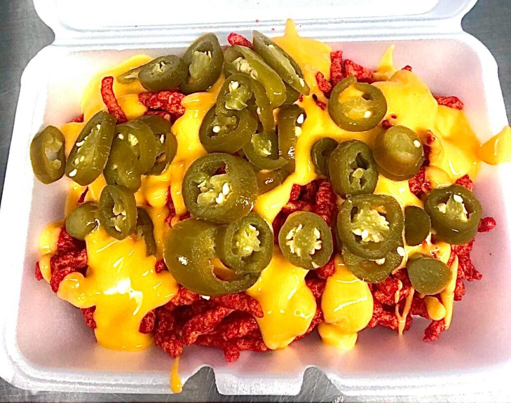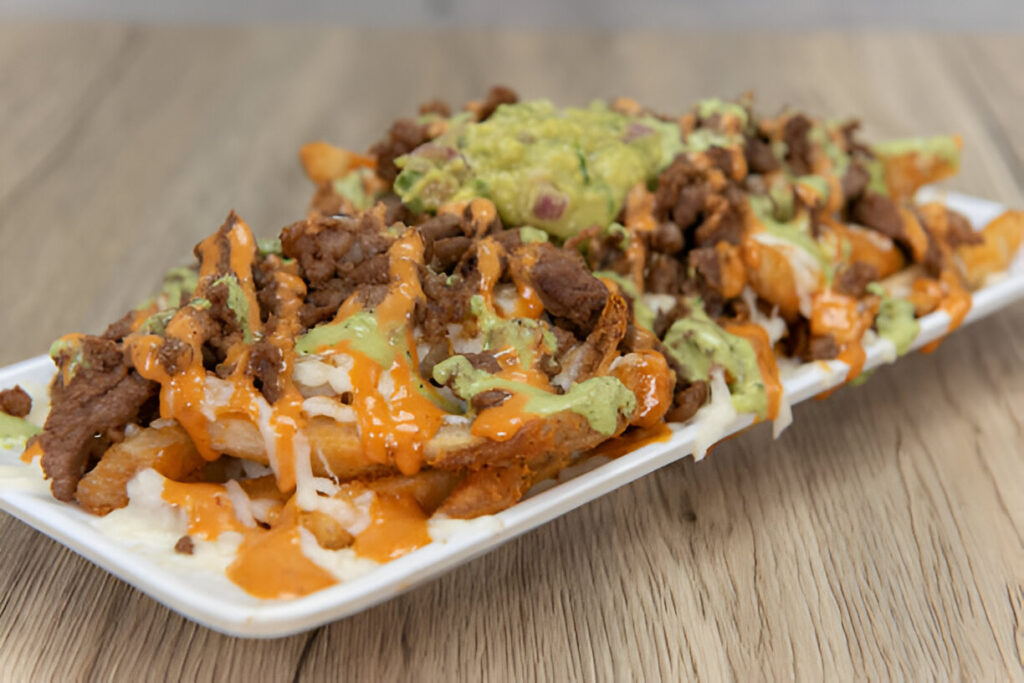 Freshly cut fries, drizzled with nacho cheese, topped with asada meat, generous amount of hot Cheetos, more nacho cheese, sour cream drizzled on top as well as cilantro and guacamole.