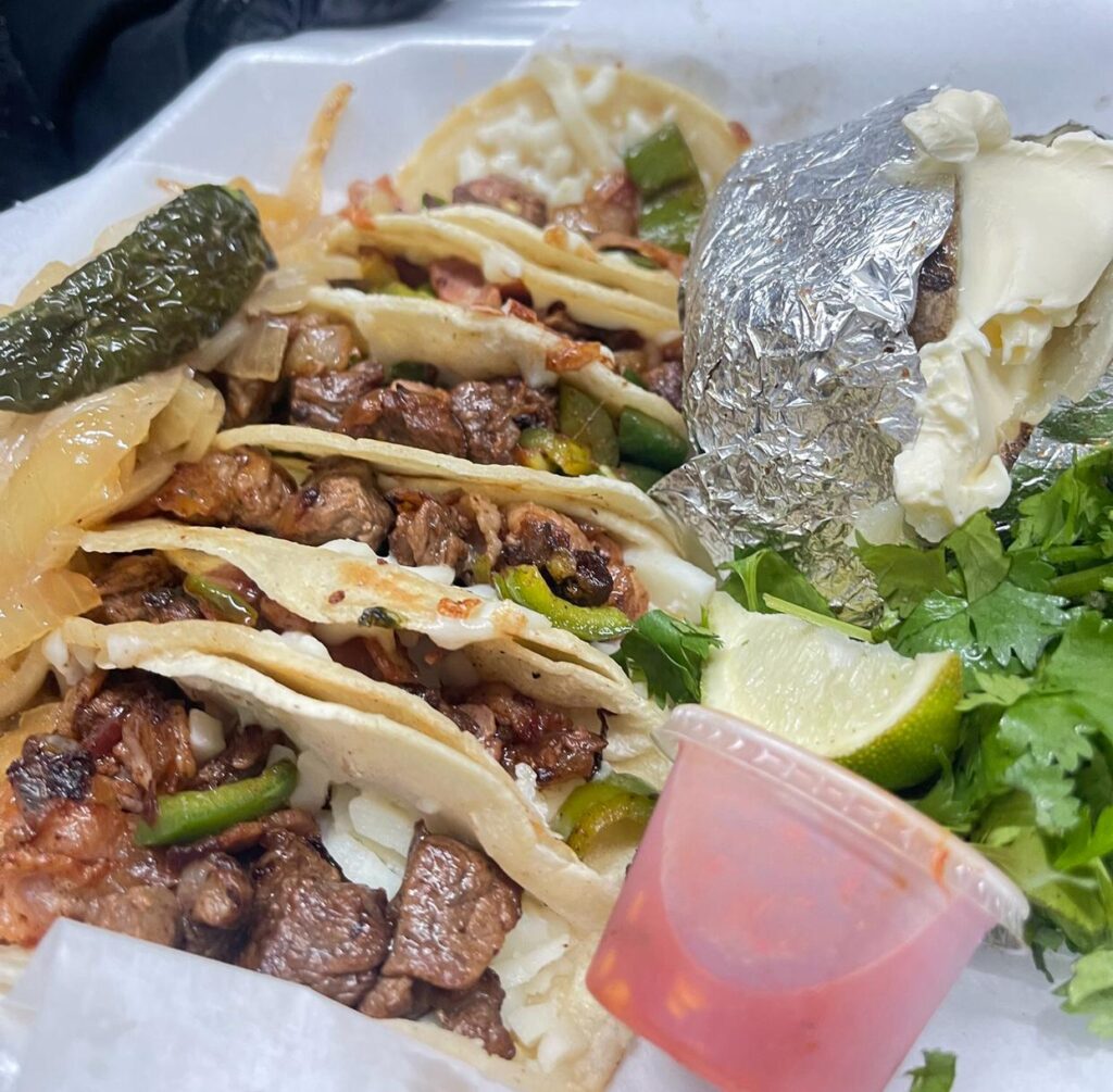 6 piece tacos of asada sautéed with onion, jalapeños and bacon. Includes baked potato, cilantro, onion, limes and red salsa.
