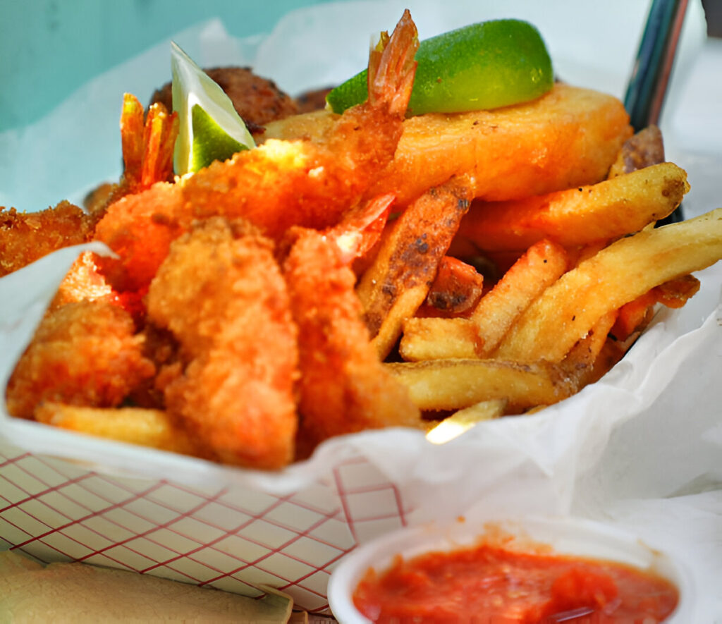 Freshly cut fries, sprinkled with shredded mix cheese, asada, grilled shrimp, sour cream, cilantro and guacamole.